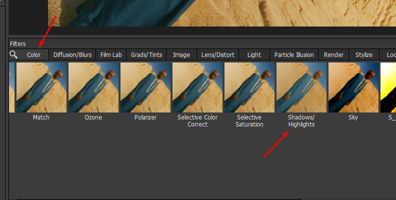 The first filter to apply is Shadows/Highlights to brighten the area you isolate with the mask. In the filters library below the viewer, click the Color tab, swipe to find the Shadows/Highlights filter, and click on it to apply it to the layer.