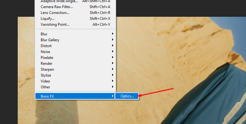 Then, go to Filters, find the Boris FX category, and click Optics to apply Optics to the smart object layer. Wait for the Optics interface to launch.