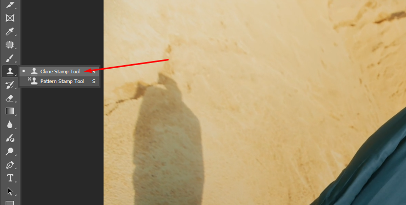 To sample an area, hold ALT (on Windows) or Option (Mac) and click over the image. This sets the starting point from which the tool will clone. Now move over the shadows and click to start painting over the shadows by copying pixels from the sample.