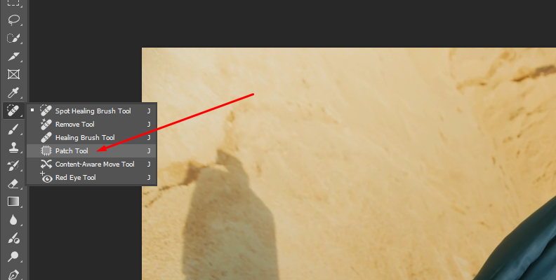 Next is getting rid of those pesky shadows affecting the image. Use the patch tool to select the shadows and then drag the selection to a shadowless area. The content-aware function will blend the pixels to make a smooth patch.